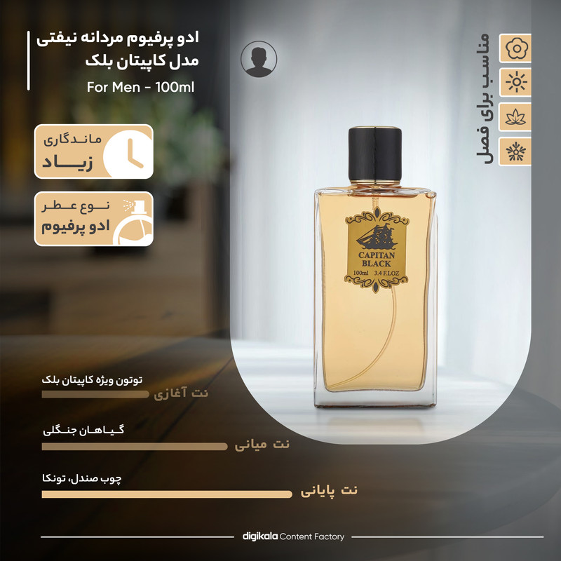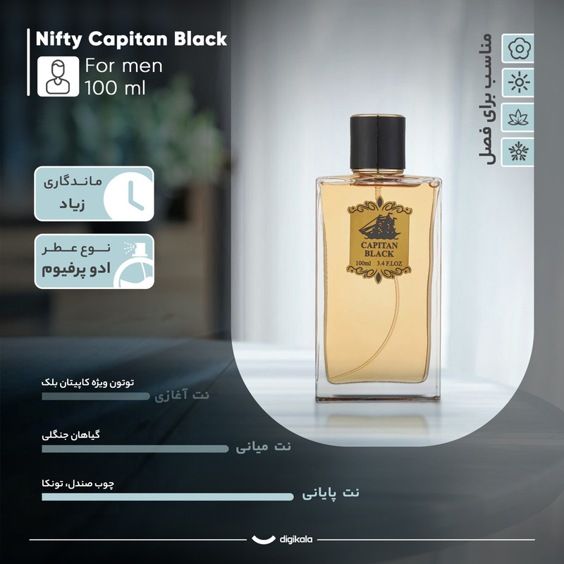 ادو پرفیوم مردانه نیفتی مدل کاپیتان بلک حجم 100 میلیلیتر، تجربهای از رایحههای دلانگیز و چشمگیر را ارائه میدهد. نت آغازی این عطر، با بوی خاص توتون ویژه کاپیتان بلک، حسی از قدرت و استقلال را به همراه دارد. نتهای میانی و پایانی که از گیاهان جنگلی الهام گرفته شدهاند، احساسی از طراوت و زندگی در دل طبیعت را به ارمغان میآورند. رایحه گرم و شیرین این عطر، با تندی ملایمی که دارد، برای استفاده در شبهای سرد زمستانی بسیار مناسب است. ساختار رایحهای که شامل مرکبات، خاک و زمین، چوب و ادویه است، ترکیبی کلاسیک و در عین حال مدرن را به وجود میآورد که برای مردانی که به دنبال تمایز هستند، ایدهآل است.ادو پرفیوم مردانه نیفتی مدل کاپیتان بلک، با رایحهای که همزمان گرم و شیرین است و با نتهای تند و ادویهای آمیخته شده، انتخابی بینظیر برای مردانی است که میخواهند حضوری بهیادماندنی داشته باشند.